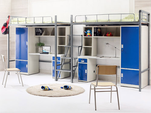 公寓床的組成,一般是包括床、書柜、衣柜、書桌這幾個(gè)家具,通常是采用上床下桌的組合方式,書桌將書柜和衣柜連載一起,整體是一個(gè)立體空間組合,不僅節(jié)省空間,而且比較整齊美觀。爬梯是在書柜這一方,床安裝護(hù)欄,確保睡覺(jué)時(shí)不會(huì)出事。